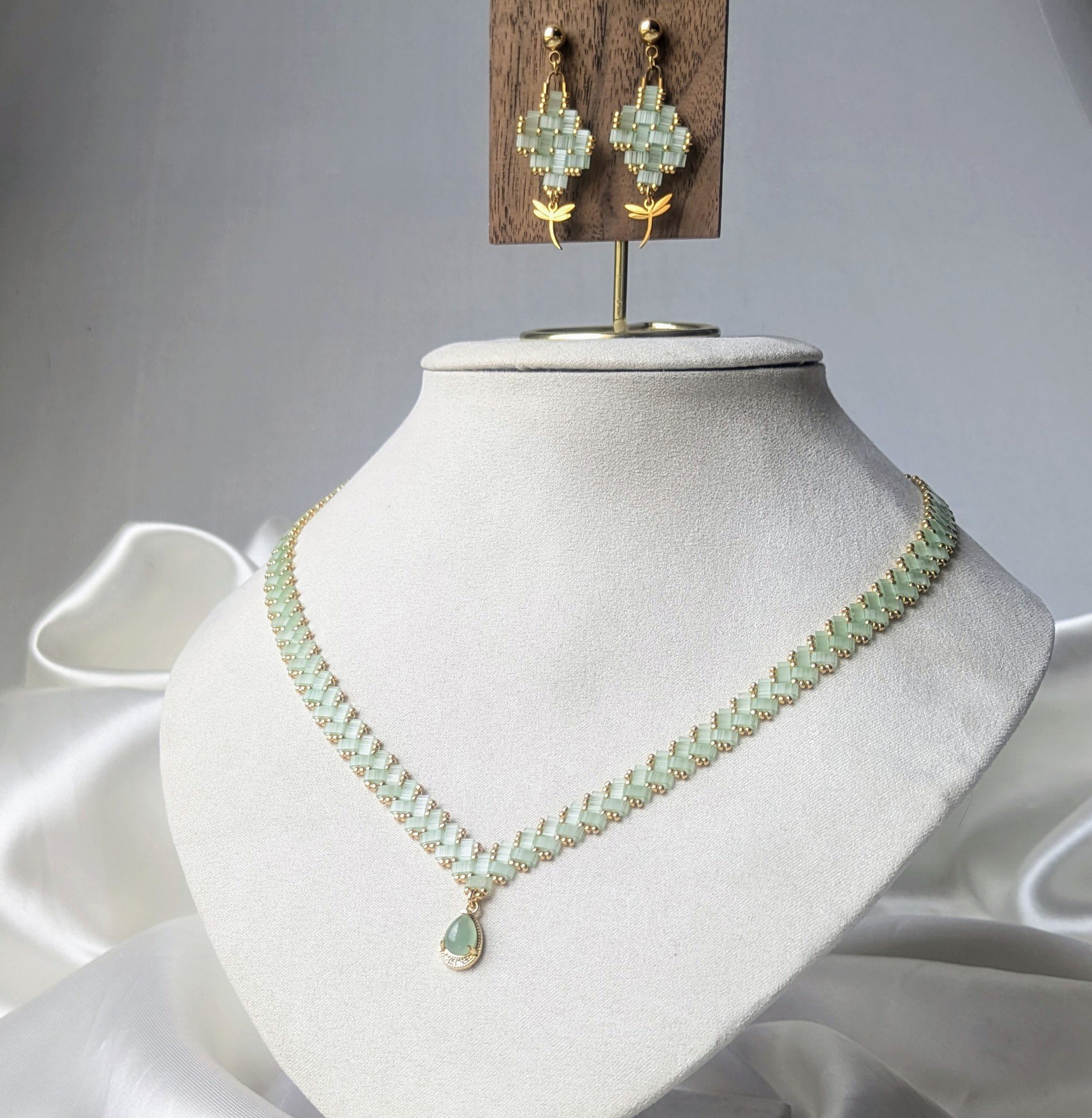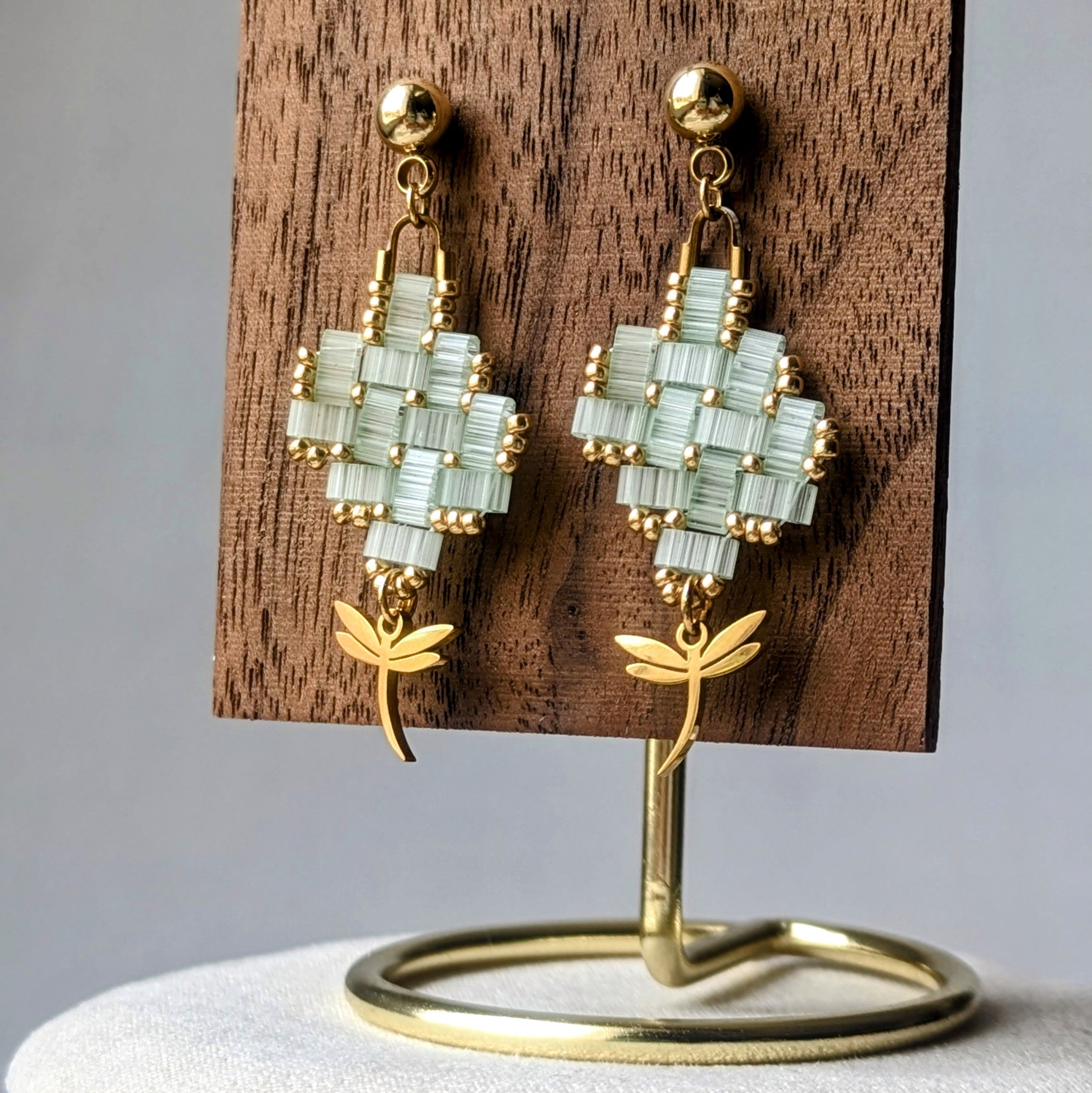 Leur motif géométrique, aux teintes vert tendre subtilement irisé, évoque les jeunes pousses qui émergent au printemps. Les perles dorées viennent réchauffer l’ensemble et capter la lumière, tandis que la fine libellule suspendue en mouvement symbolise la transformation, la légèreté et l’éveil de l’âme.