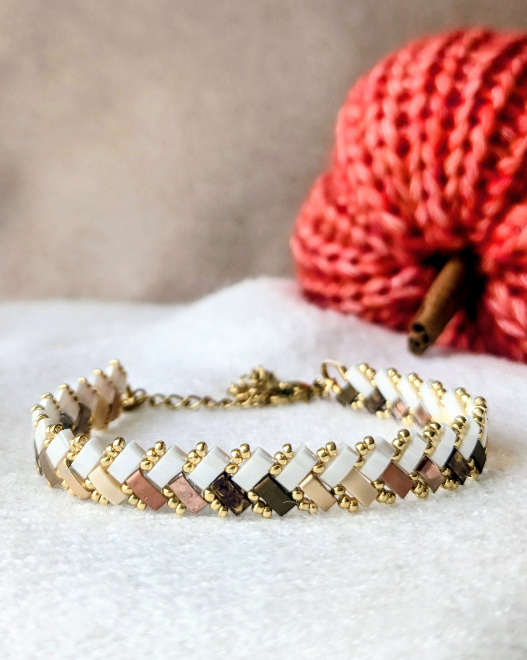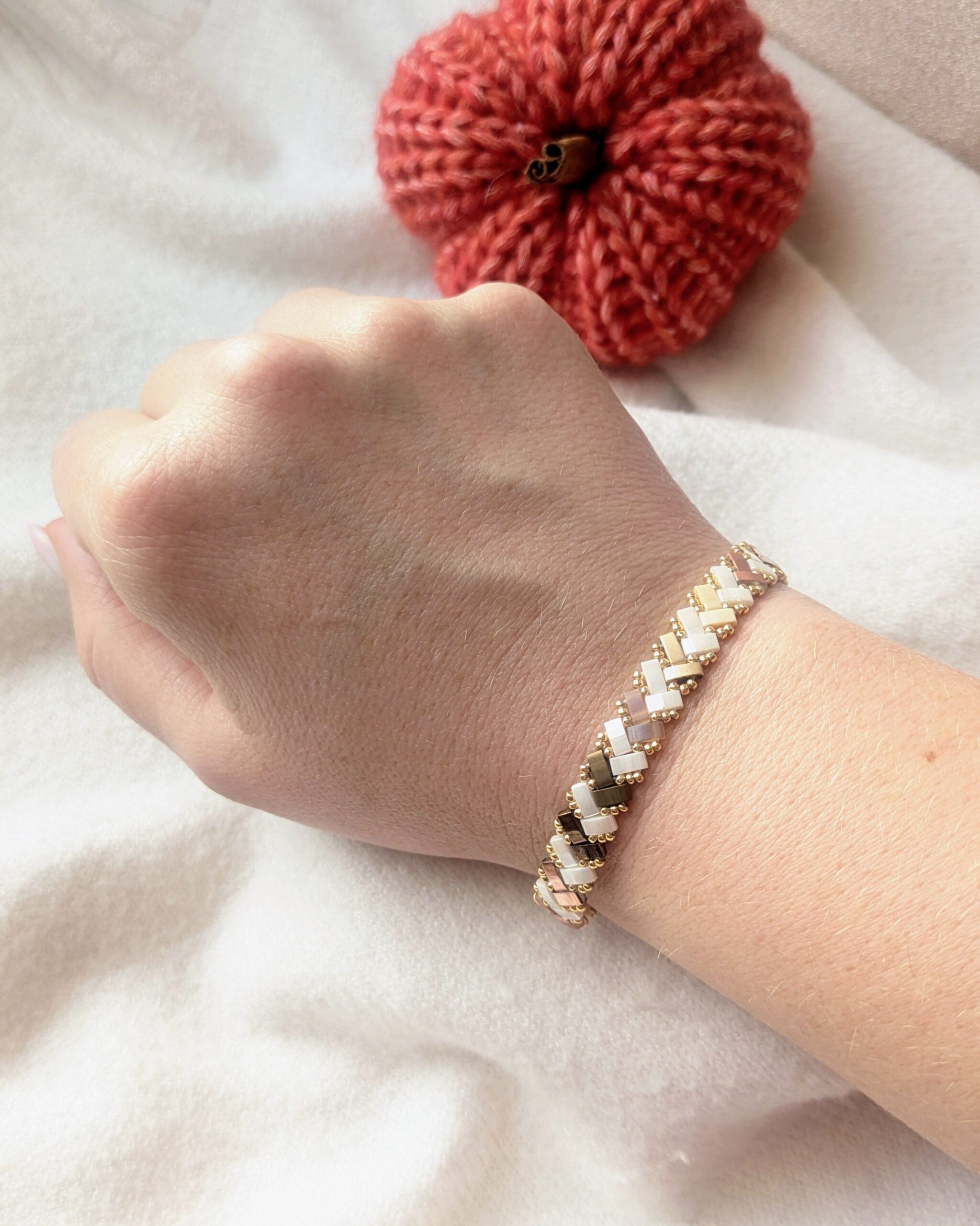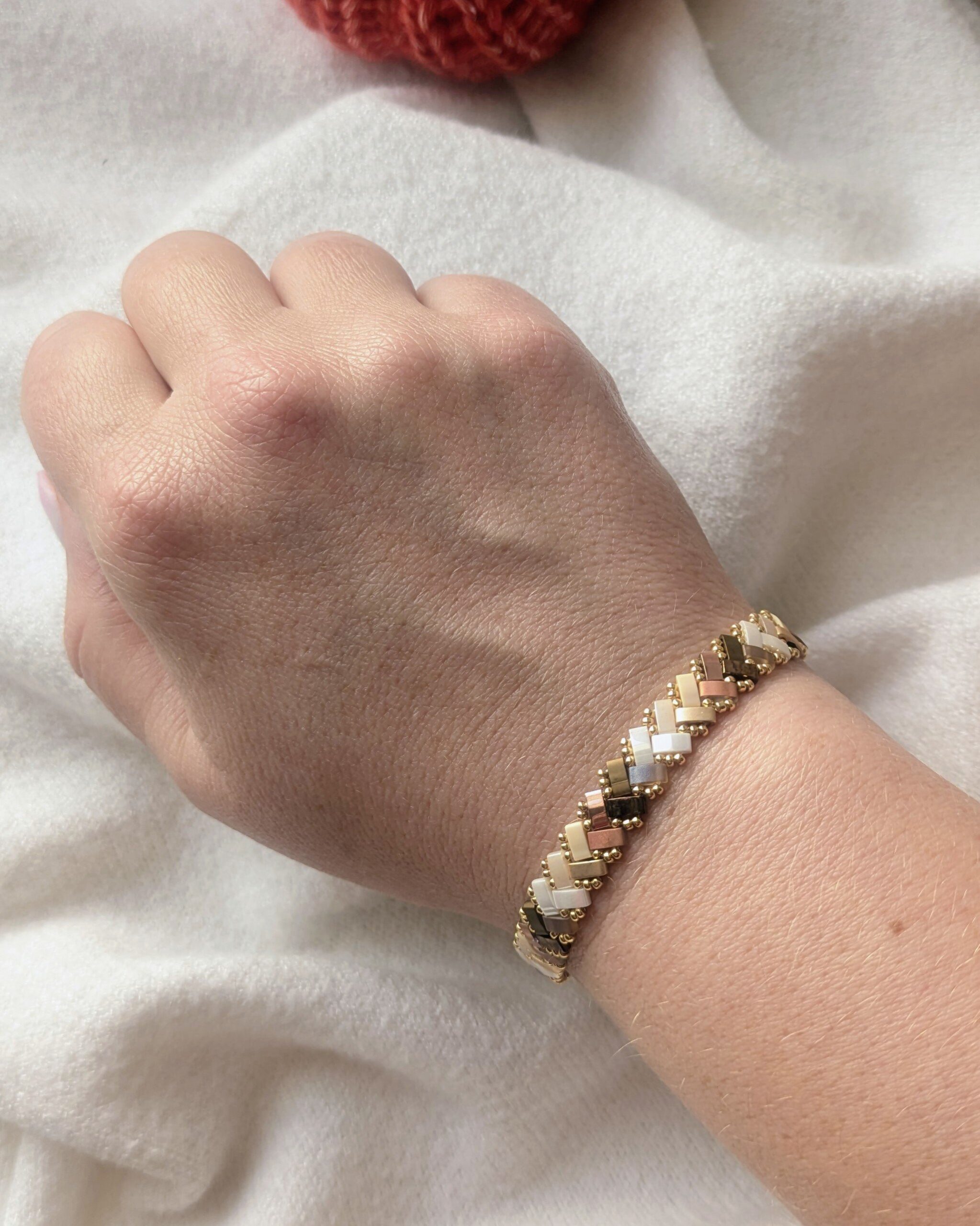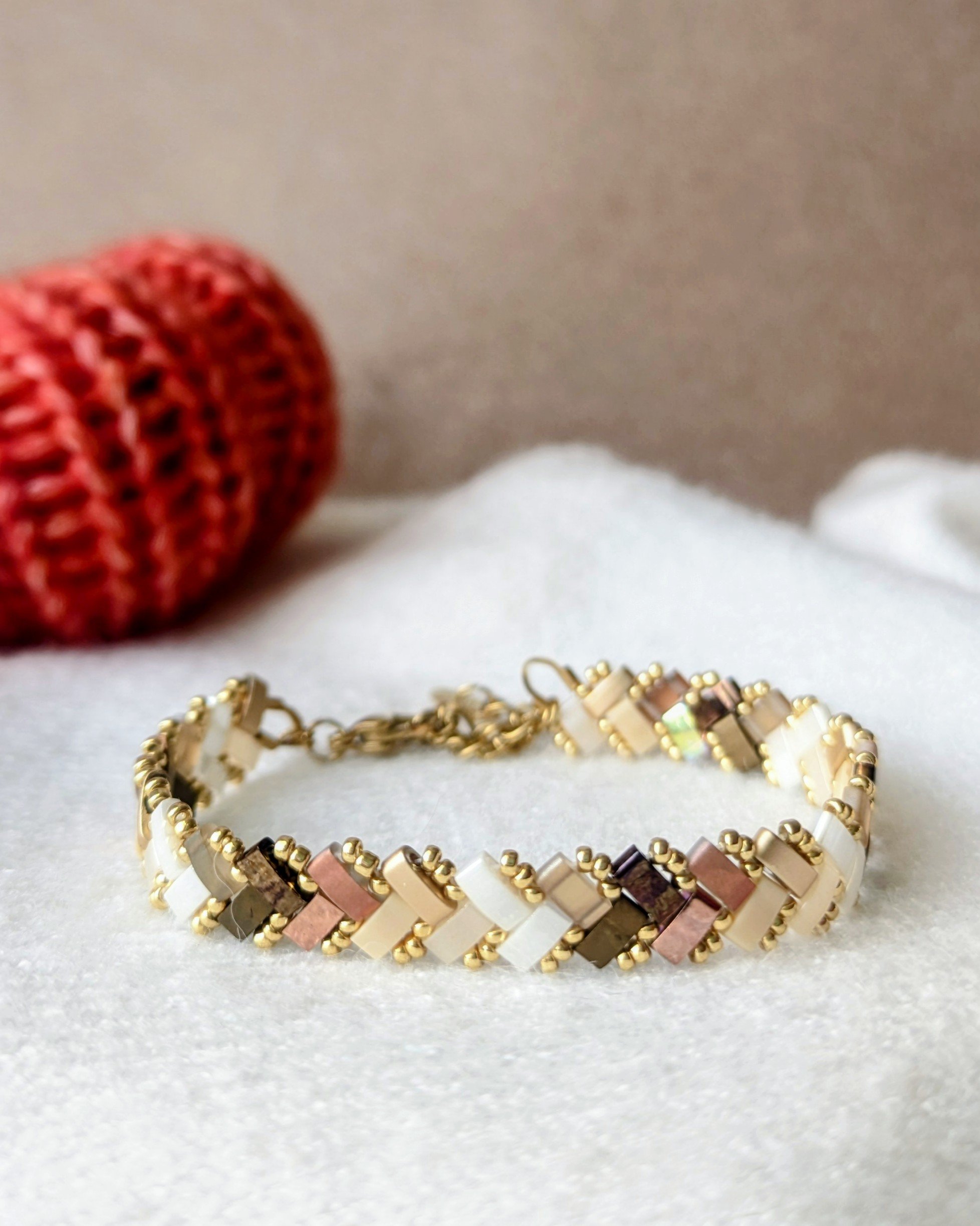 Matériaux : perles de verre Miyuki Half Tila & rocailles dorées, fil nylon haute résistance, acier inoxydable doré