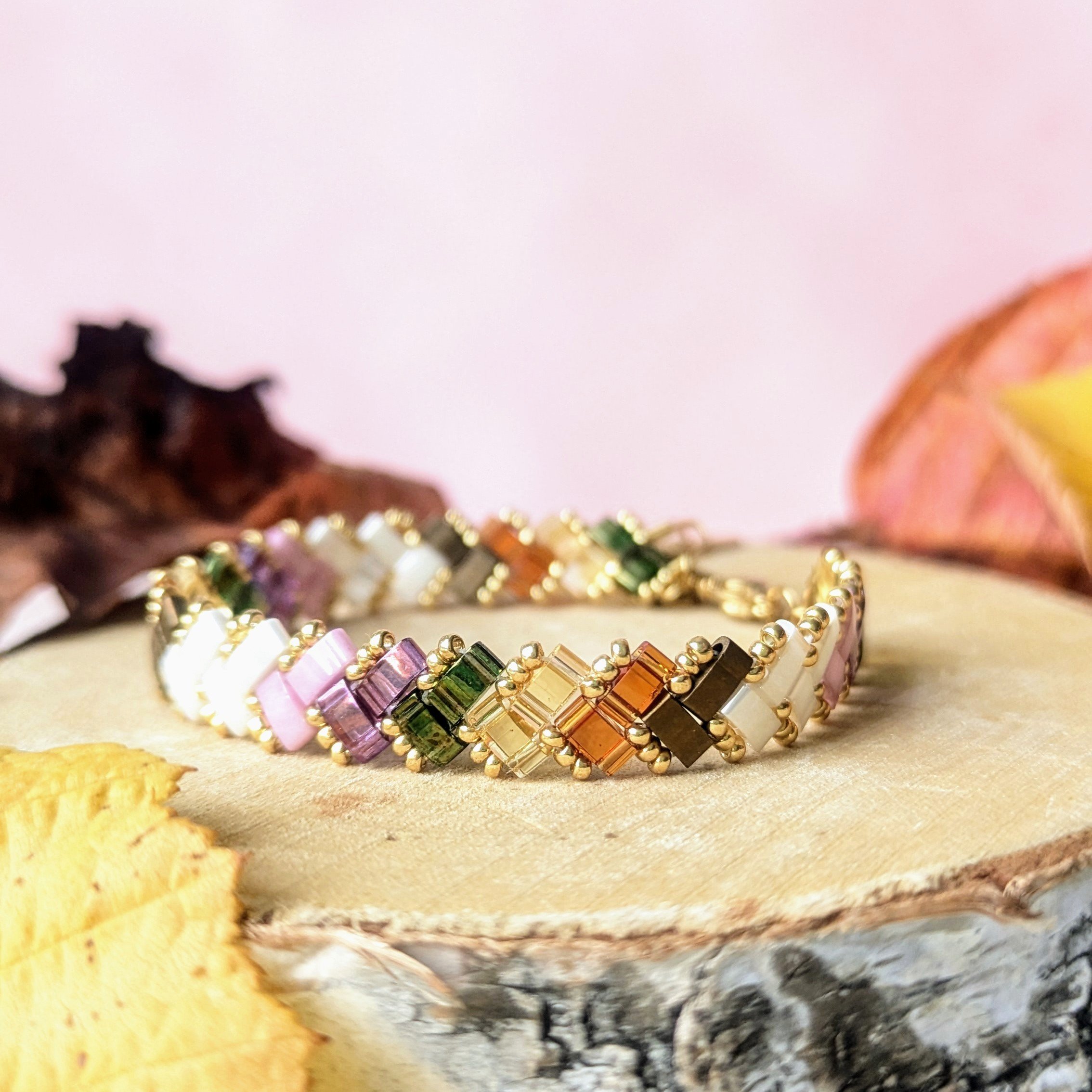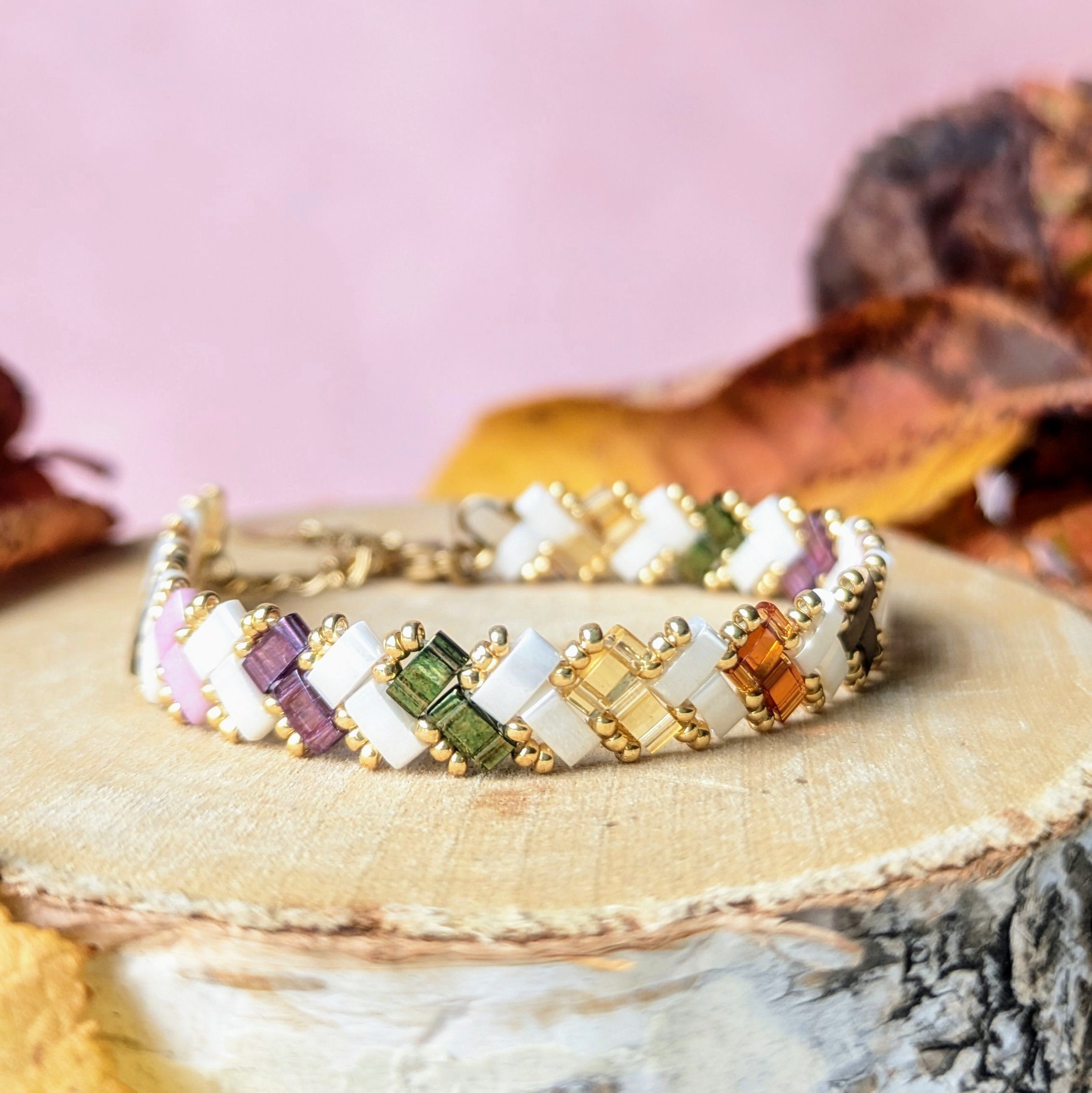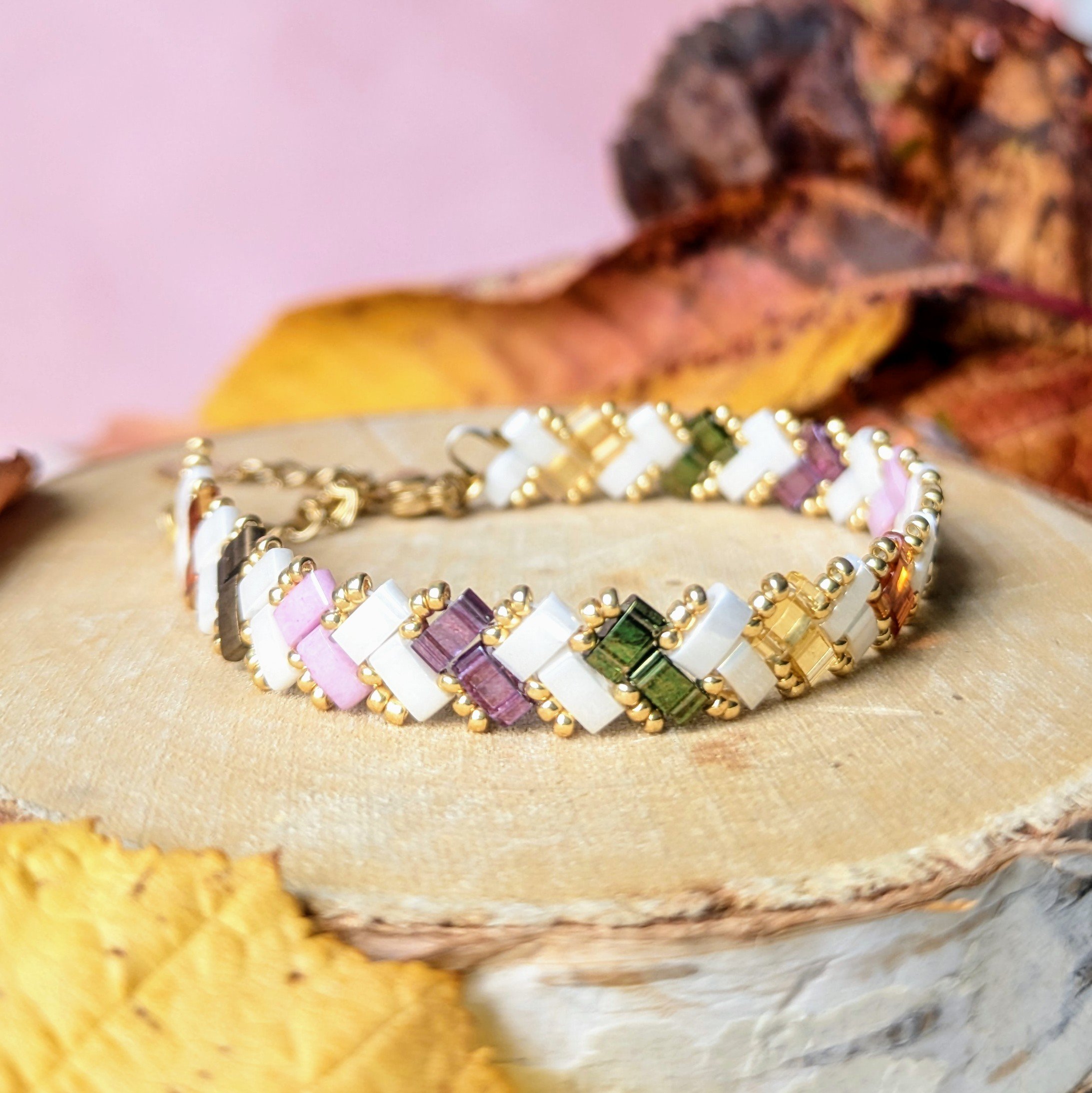 ✨ Matériaux : perles de verre Miyuki (Half Tila et rocailles), fil nylon très résistant, acier inoxydable doré