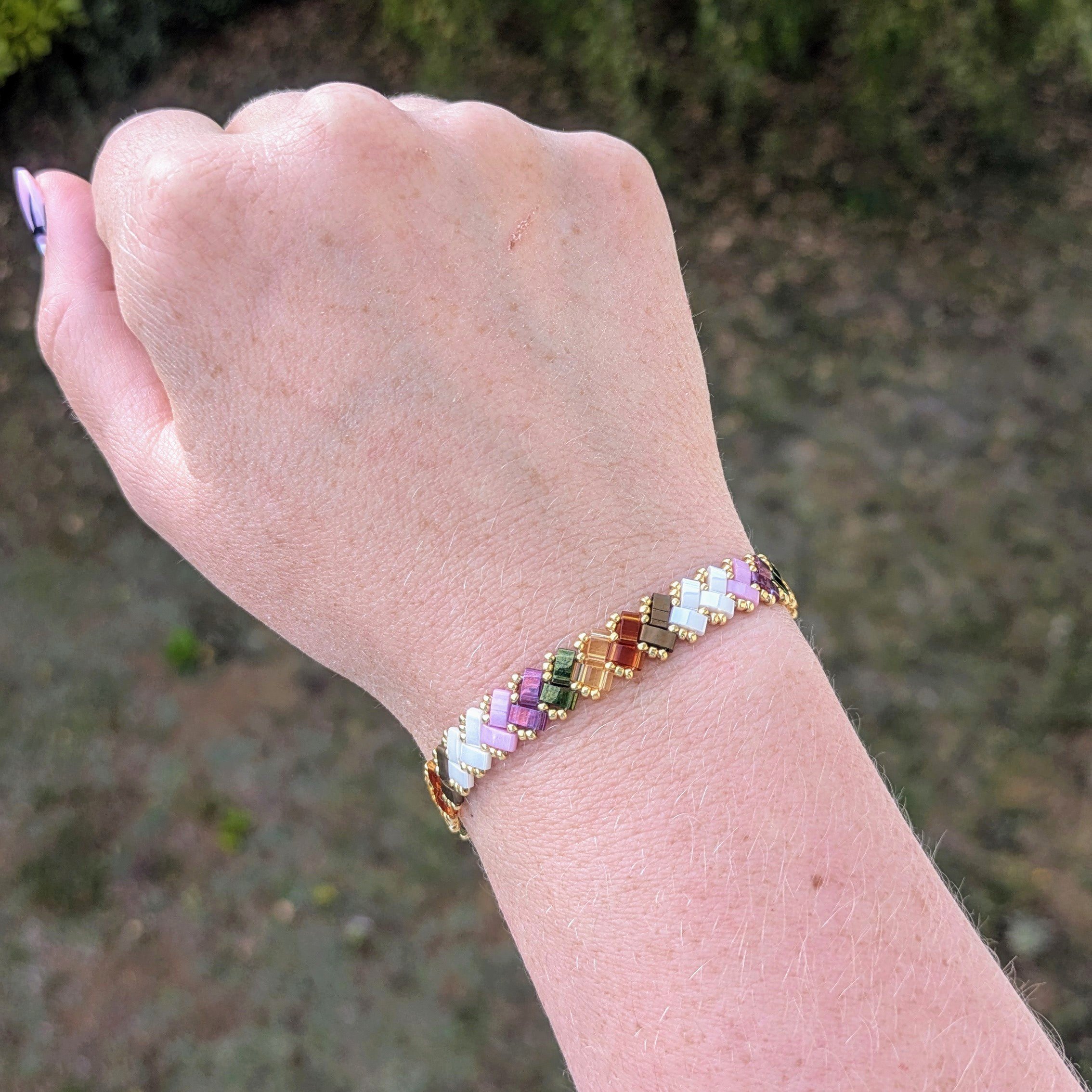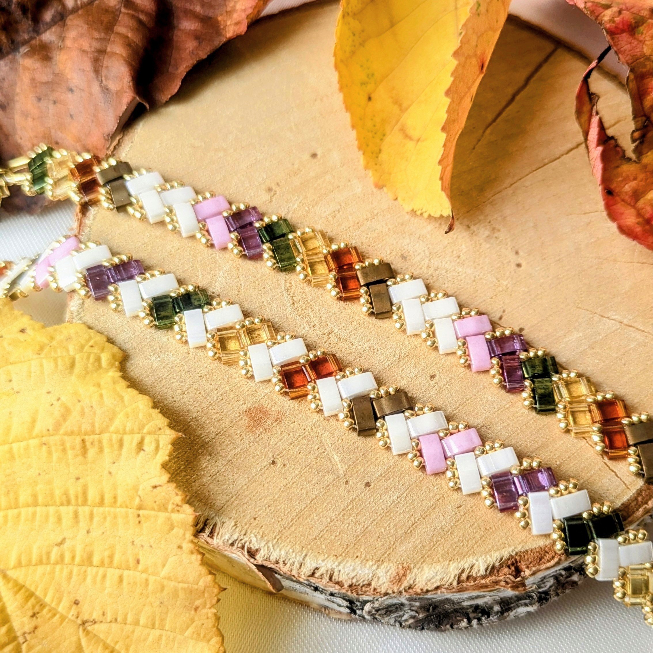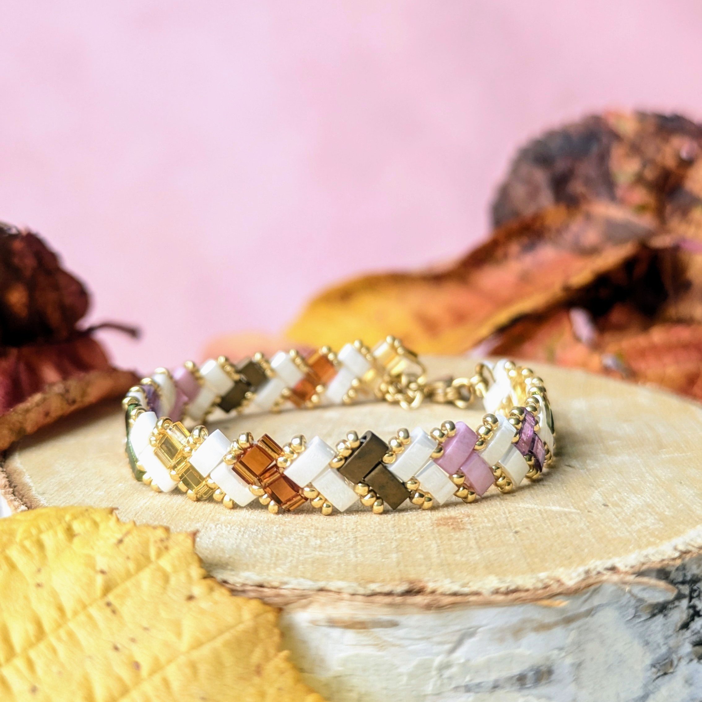 ✨ Matériaux : perles de verre Miyuki (Half Tila et rocailles), fil nylon très résistant, acier inoxydable doré