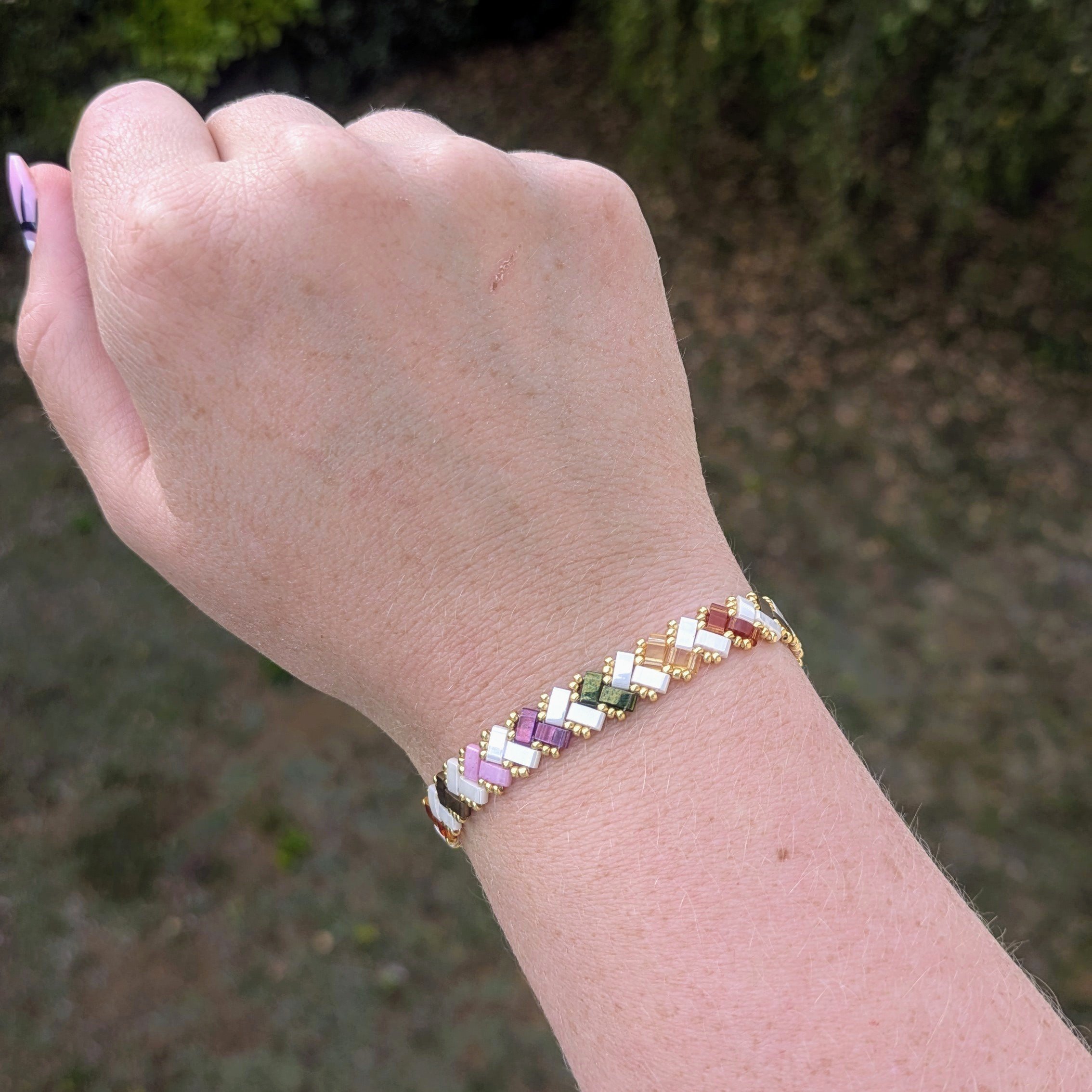 Chaque perle Half Tila, patiemment enfilée à l’aiguille, s’harmonise avec les rocailles dorées qui bordent le tissage, pour une finition lumineuse et élégante.