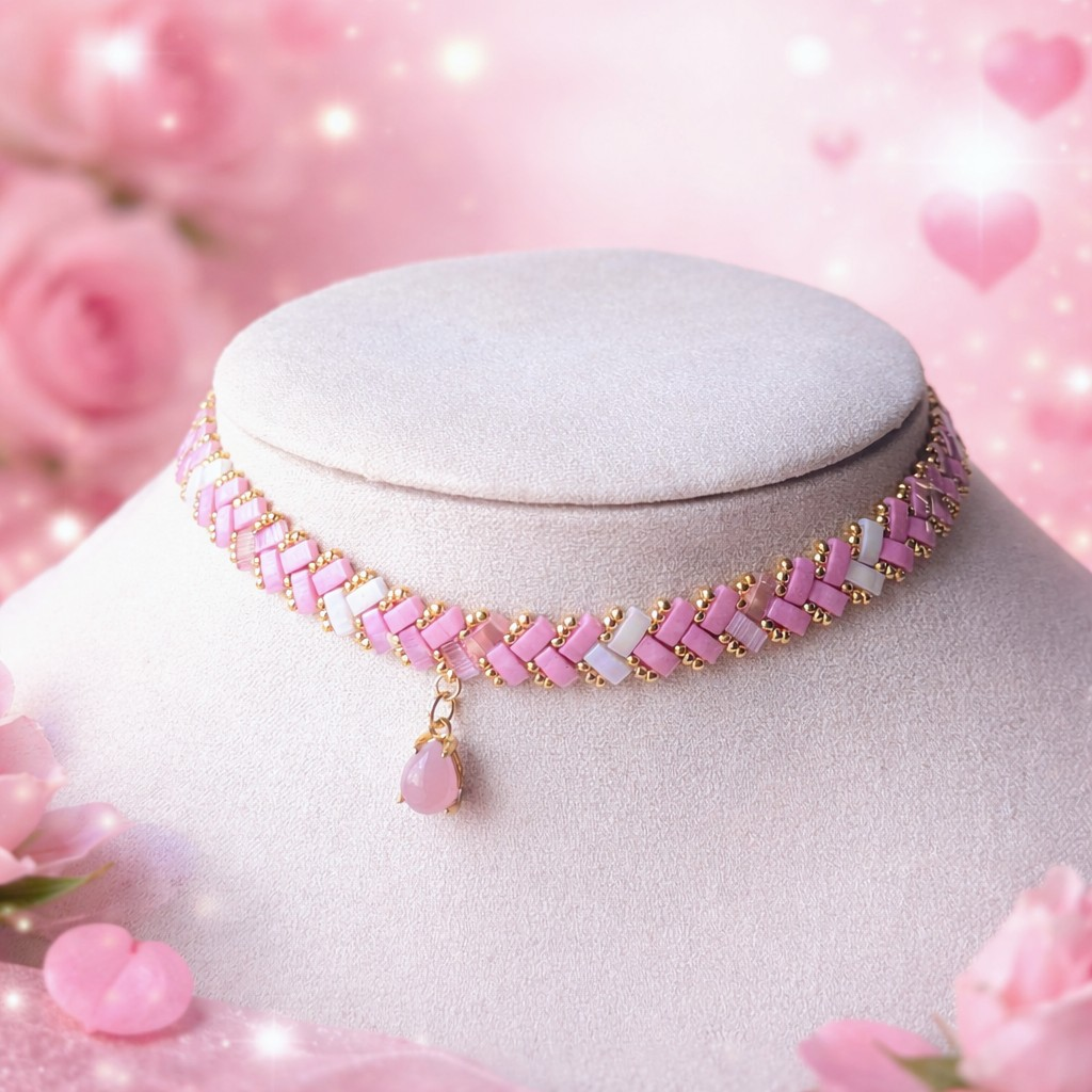 Ses perles roses poudrées évoquent la tendresse et l’attachement sincère, les touches de blanc symbolisent la pureté de l’intention, et les perles dorées apportent une lumière subtile sur la peau.